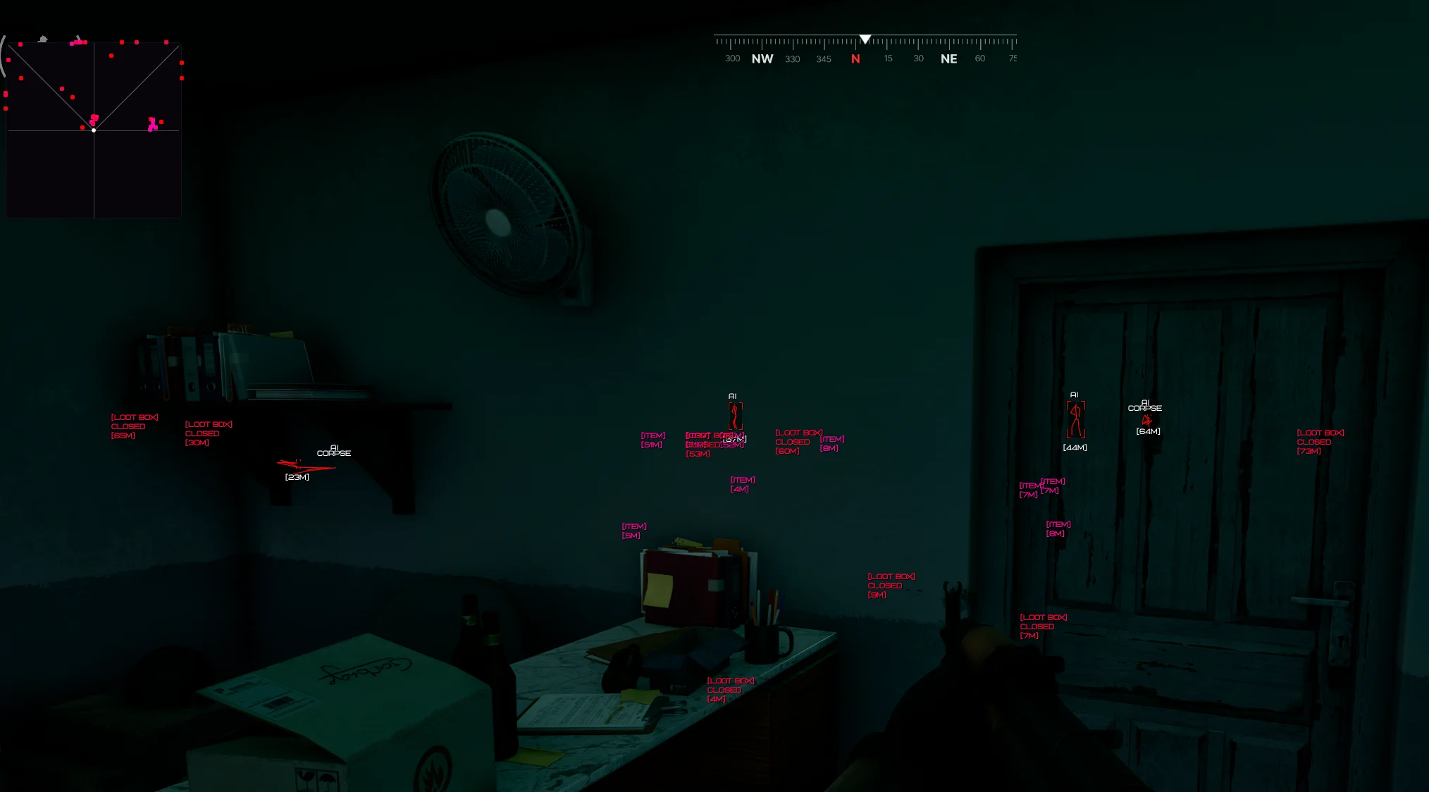 Loot ESP shows weapons, ammunition, armor, containers, medical supplies, and other items. Filtering by loot type, item name display, and nearest item lists are available.